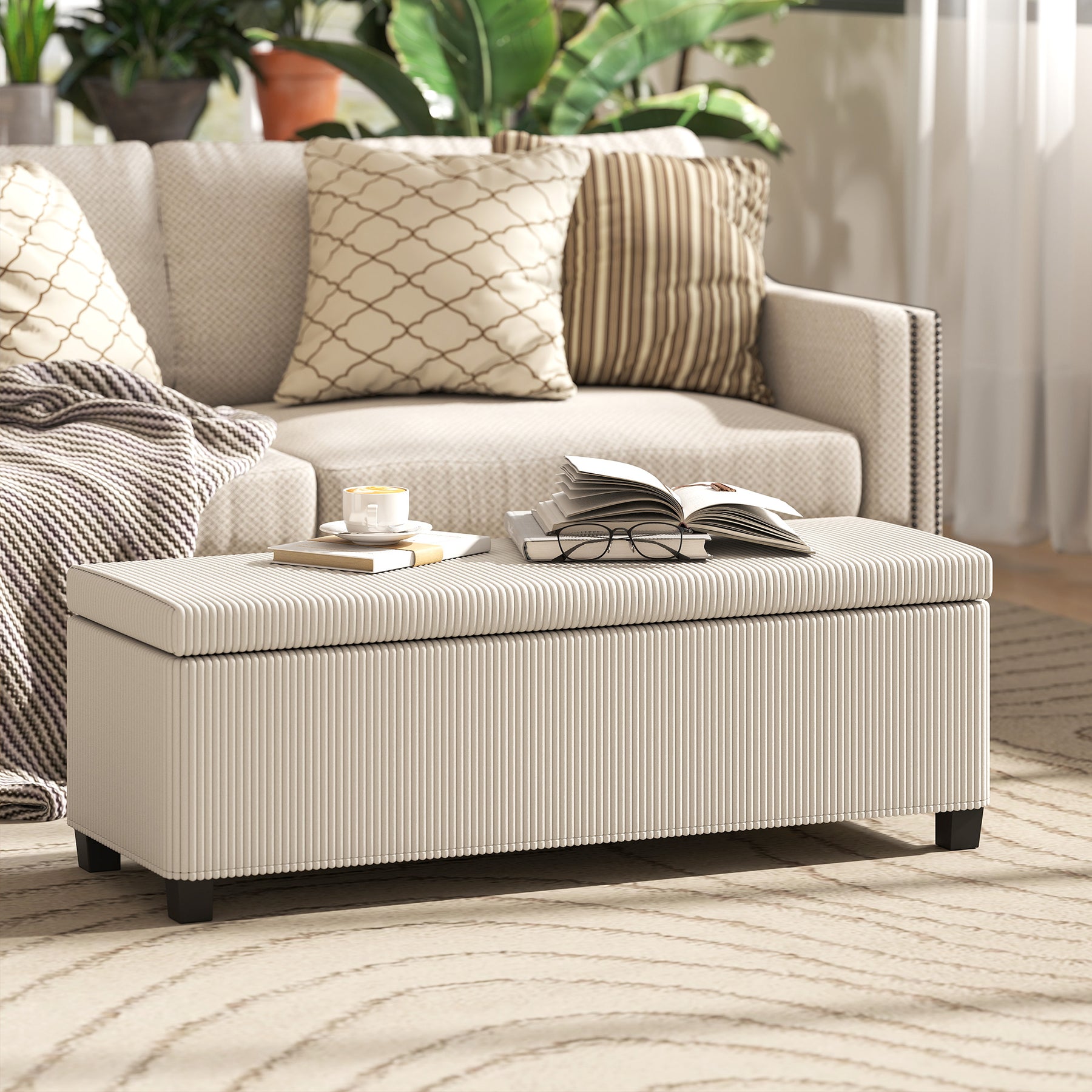 Transform your space with the HOMCOM Storage Ottoman for the living room, featuring a chic, breathable corduroy design that's as skin-friendly as stylish. Dive into its spacious interior, which is great for tucking away bedding or magazines. Doubling as a footstool or a cozy window bench, this bench with storage adds a touch of elegance wherever you place it. Features: - Elegant corduroy design enhances your room's esthetic appeal - Breathable, skin-friendly corduroy and soft original foam padding offer comfortable seating - Wear-resistant material ensures long-lasting use - Large storage space keeps bedding and magazines organized - Stable steel frame supports substantial weight securely - Assembly takes only 10 minutes - Functions as a footstool, shoe bench, or stylish extra seat Specification: - Color: Beige - Materials: Corduroy (100% Polyester), Foam, Steel, Multi-layered Board - Overall Dimension: 47.2" W x 16.5" D x 15.7" H - Storage Size: 44.5" W x 13.8" D x 9.1" H - Storage Volume: 23.8 gal - Weight Capacity: 485 lbs. - Item Label: 838-531V00BG Package Includes: - 1 x Storage Ottoman - 1 x Manual Transform your space with the HOMCOM Storage Ottoman for the living room, featuring a chic, breathable corduroy design that's as skin-friendly as stylish. Features: - Elegant corduroy design enhances your room's esthetic appeal - Breathable, skin-friendly corduroy and soft original foam padding offer comfortable seating - Wear-resistant material ensures long-lasting use - Large storage space keeps bedding and magazines organized - Stable steel frame supports substantial weight securely - Assembly takes only 10 minutes - Functions as a footstool, shoe bench, or stylish extra seat Specification: - Color: Gray - Materials: Corduroy (100% Polyester), Foam, Steel, Multi-layered Board - Overall Dimension: 47.2" W x 16.5" D x 15.7" H - Storage Size: 44.5" W x 13.8" D x 9.1" H - Storage Volume: 23.8 gal - Weight Capacity: 485 lbs. - Item Label: 838-531V00GY Package Includes: - 1 x Storage Ottoman - 1 x Manual Transform your space with the HOMCOM Storage Ottoman for the living room, featuring a chic, breathable corduroy design that's as skin-friendly as stylish. Features: - Elegant corduroy design enhances your room's esthetic appeal - Breathable, skin-friendly corduroy and soft original foam padding offer comfortable seating - Wear-resistant material ensures long-lasting use - Large storage space keeps bedding and magazines organized - Stable steel frame supports substantial weight securely - Assembly takes only 10 minutes - Functions as a footstool, shoe bench, or stylish extra seat Specification: - Color: Gray - Materials: Corduroy (100% Polyester), Foam, Steel, Multi-layered Board - Overall Dimension: 44.1" W x 16.5" D x 15.7" H - Storage Size: 41.3" W x 13.8" D x 9.1" H - Storage Volume: 22.2 gal - Weight Capacity: 485 lbs. - Item Label: 838-527V00GY Package Includes: - 1 x Storage Ottoman - 1 x Manual.